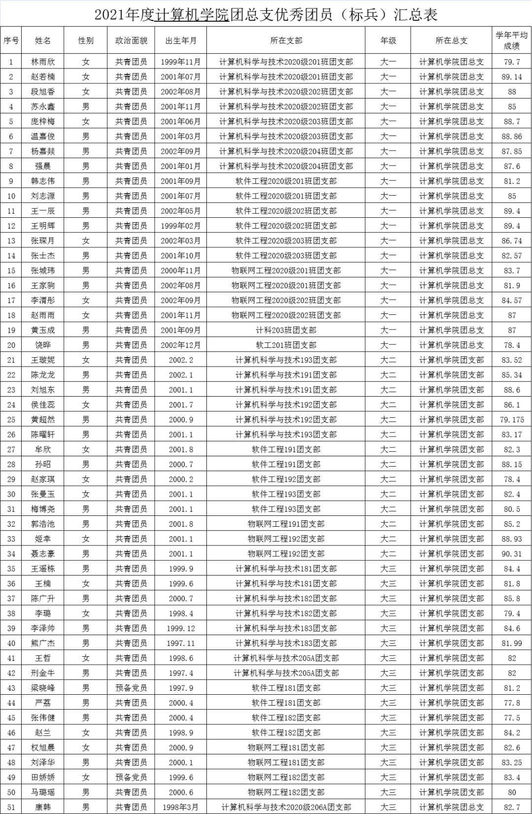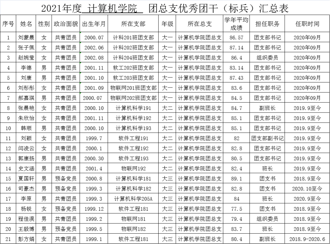 按照校团委《关于开展2021年度韦德官方网站共青团先进集体和优秀个人的评比表彰》文件要求,计算机学院团总支已全部完成评比工作。各班级团支部依据支部投票结果评预推荐对象,公司团总支结合团支部青年大学习、主题团日活动、团员团干日常考核、团支部建设等情况,全面并根据上一学年考试成绩进行最终评定,确定最终推荐对象。现将拟订优秀团员(标兵)、优秀团干(标兵)、优秀团支部和星级志愿者名单进行公示。