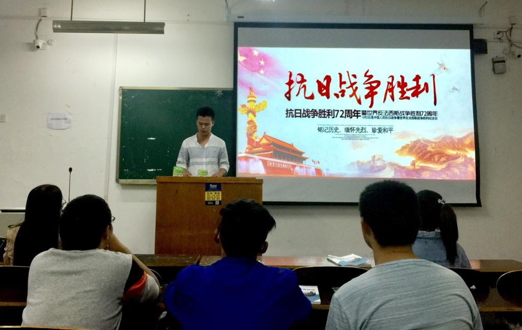 在对抗日战争有了更全面深刻的认识后,各班围绕抗日战争胜利开展演讲、朗诵、讨论等活动,从不同的角度表达了对抗日战争胜利的纪念。团总支书记米嘉琪希望大家珍惜来之不易的和平环境,热爱生活,同时在9·18来临之际做好安全防范工作,严格遵守校规校纪。