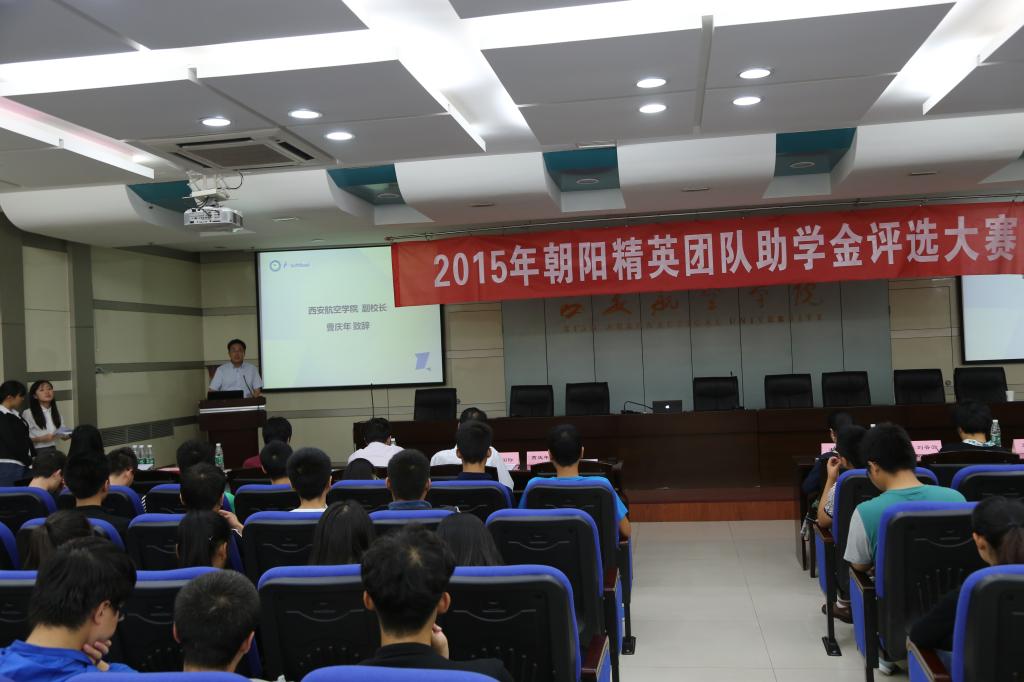 西安丝路软件有限公司副总经理王莺女士讲话,表示对校企合作班员工的朝阳精英团队助学金评选大赛路演的期待,提出了对全体同学的寄语。教务处米国际处长介绍了“互联网+创新创业”大赛的情况,并通报了公司获奖情况:由公司石锋老师带领的员工获得了该项大赛的省级铜奖。