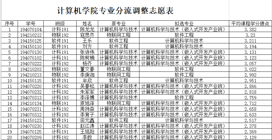 根据《计算机大类培养专业分流工作实施办法(试行)》文件要求,现将符合分流专业调整条件的名单予以公示,公示期为2021.7.22-2021.7.29,如有异议,须在公示期内以班为单位汇总向员工科反馈。